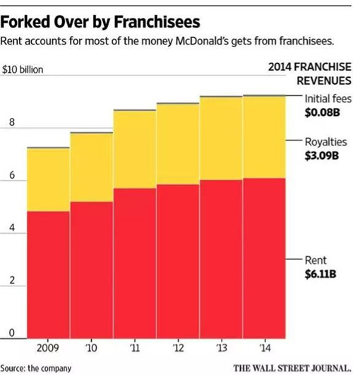 這是雷·克羅克在早期設(shè)計(jì)麥當(dāng)勞的特許經(jīng)營模式時(shí),就留下的一個(gè)獨(dú)到之處:為了加強(qiáng)控制權(quán),所有門店所需要的土地物業(yè),都要由麥當(dāng)勞總部出面收購,再轉(zhuǎn)租給特許經(jīng)營商,每年按略低于市場價(jià)的水平收購租金。在房地產(chǎn)市場節(jié)節(jié)攀升時(shí),租金收入會(huì)水漲船高;而一旦特許經(jīng)營商表現(xiàn)欠佳,也可以隨時(shí)將他們“掃地出門”。一些持有麥當(dāng)勞股票的對(duì)沖基金經(jīng)理們甚至曾經(jīng)想過,把麥當(dāng)勞的餐飲和房地產(chǎn)業(yè)務(wù)拆分成兩部分,以便更有效地管理資產(chǎn)。
