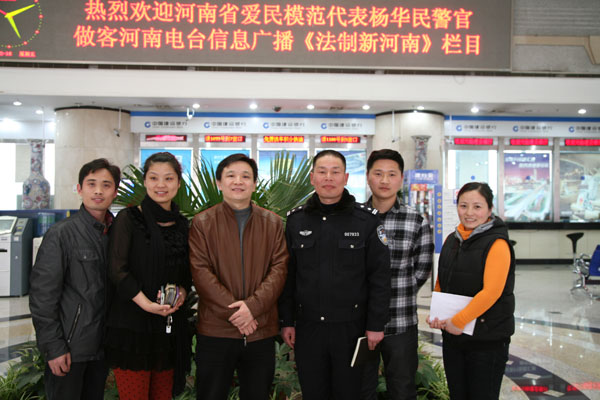 2012年3月16日下午四點,中央電視臺攝制組進入河南電臺信息廣播《法制新河南》節(jié)目直播間進行了拍攝。在節(jié)目中做客的是全國愛民模范鄭州市花園路農(nóng)業(yè)路楊華民交通示范標(biāo)準(zhǔn)崗崗長楊華民。