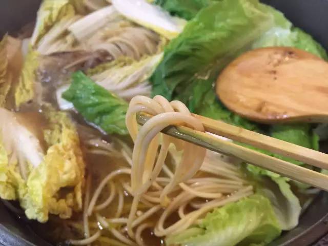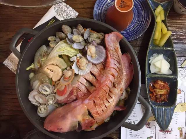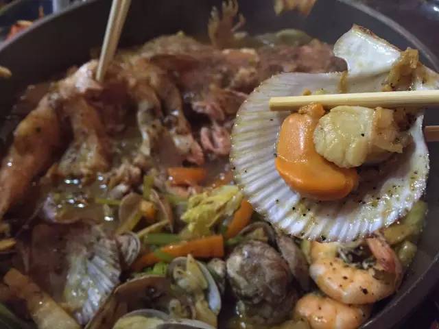 以魚、扇貝、大蝦和時(shí)蔬為鍋底,先燜制,后以米酒澆鍋,點(diǎn)火后,能看到火焰在食材上跳躍,聞到淡淡的酒香,最后的醬料可以拌意面吃,有黑椒、麻辣和酸菜三種口味。