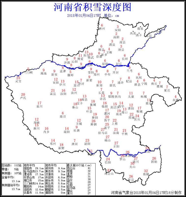 截至4日17時,除東北部外,全省大部的積雪深度普遍在5厘米以上,信陽、駐馬店、南陽、漯河、平頂山、周口、三門峽、洛陽、許昌和焦作大部積雪深度在10厘米以上,信陽、駐馬店和周口南部積雪深度多在20厘米以上,最大積雪深度出現(xiàn)在雞公山41厘米(見積雪深度附圖)。