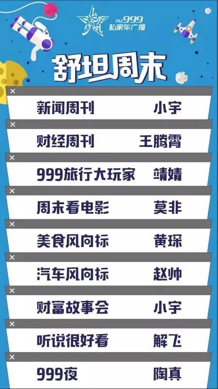 新聞周刊、財(cái)經(jīng)周刊、財(cái)富故事會、聽說很好看、美食風(fēng)向標(biāo)、汽車風(fēng)向標(biāo)……周末的生活,就得這么舒坦,就得這么輕松有料。短小趣味的節(jié)目,不同屬性的內(nèi)容,你要音樂,還是資訊,我們這里全部都有。