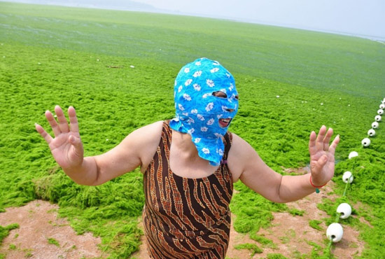 2013年7月3日,山東青島青島高溫來襲,“青島大媽”不懼滸苔,戴著“強盜面具”出現(xiàn)在海水浴場消暑降