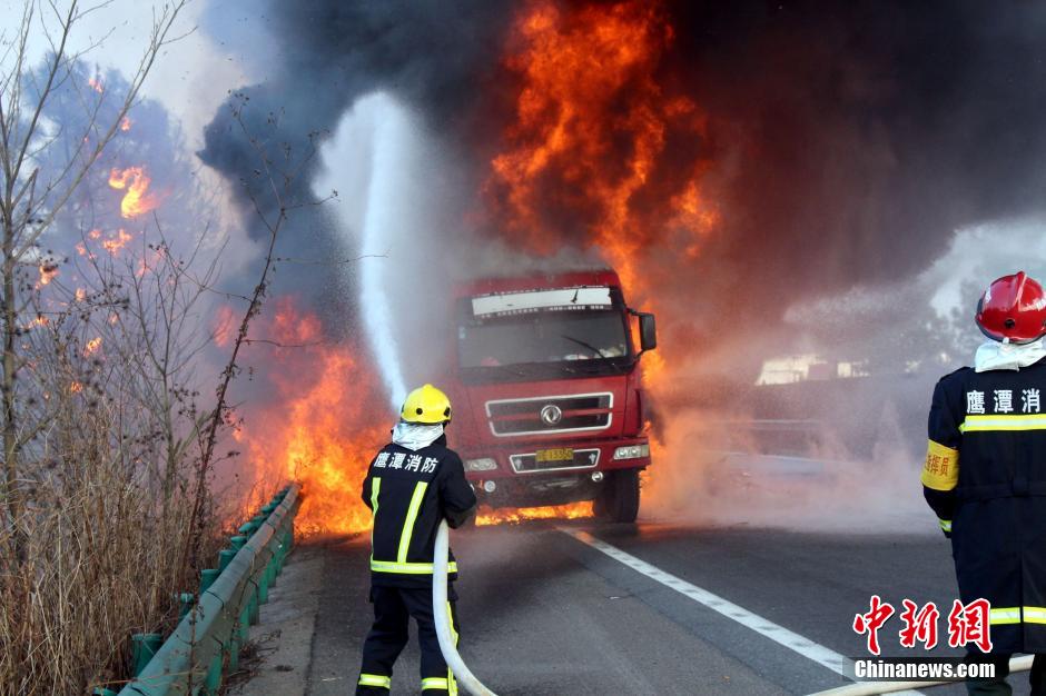 1月23日下午4時許,滬昆高速公路江西弋陽往貴溪方向593公樁(貴溪收費站附近)一輛載有133部電動車的半掛車起火,導(dǎo)致電動車被大火“吞噬”。江西貴溪消防官兵接警后迅速到場撲救,半小時后將大火撲滅。據(jù)司機(jī)稱,火災(zāi)疑因高速護(hù)坡雜草叢起火產(chǎn)生的火芯飄至半掛車,引燃包裝電動車的紙殼箱所致。中新社發(fā) 龔武 攝