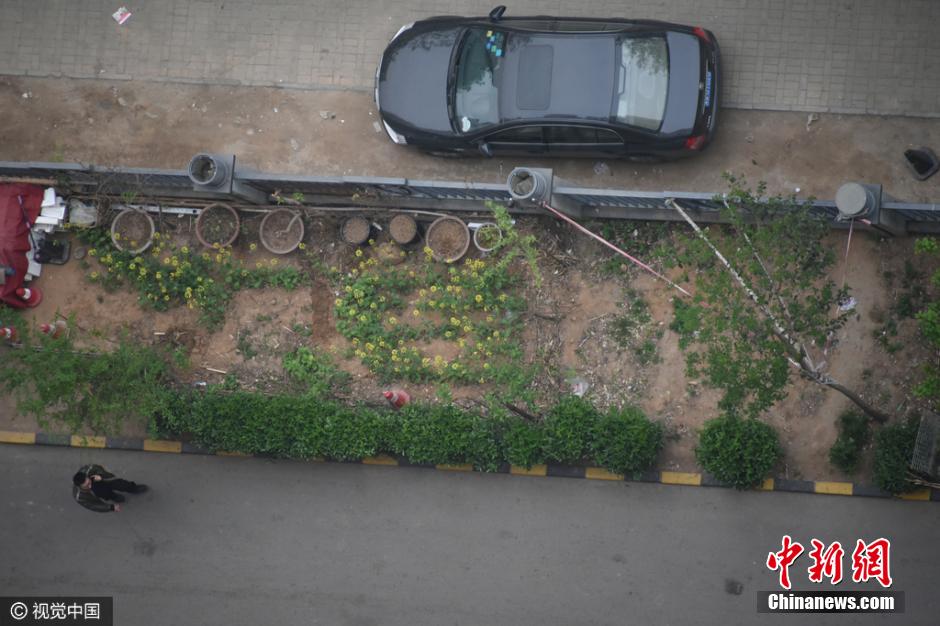 水管是從20樓放下來的,小菜園的主人用它來澆水。”未來路巡防隊(duì)員司廣紅說。在小菜園旁邊站著一名中年男子,手里拿著鐵锨。男子說,他是燕莊村民,姓張,家住9號(hào)樓20層。 李四信 攝 圖片來源:視覺中國