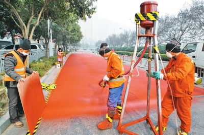 “機動車道6米寬,鋪設(shè)‘綠道’的自行車道也為6米寬??磻T了灰黑色的路面,在看到色彩明銳的‘綠道’后肯定覺得眼前一亮?!G道’只是叫法,并不是說道路外觀一定是綠色的,在景觀設(shè)計中,‘綠道’往往有著更深更廣的內(nèi)涵?!惫こ特撠?zé)人呂先生告訴記者,彩色瀝青厚度僅為1到2毫米,壽命在5年以上,具有警示、防滑、降噪、美觀等特點?!拔覈G道’通常以警示色紅色為主打,主要作用是打造人車分離模式,供騎車者和步行者休閑使用?!?/p>